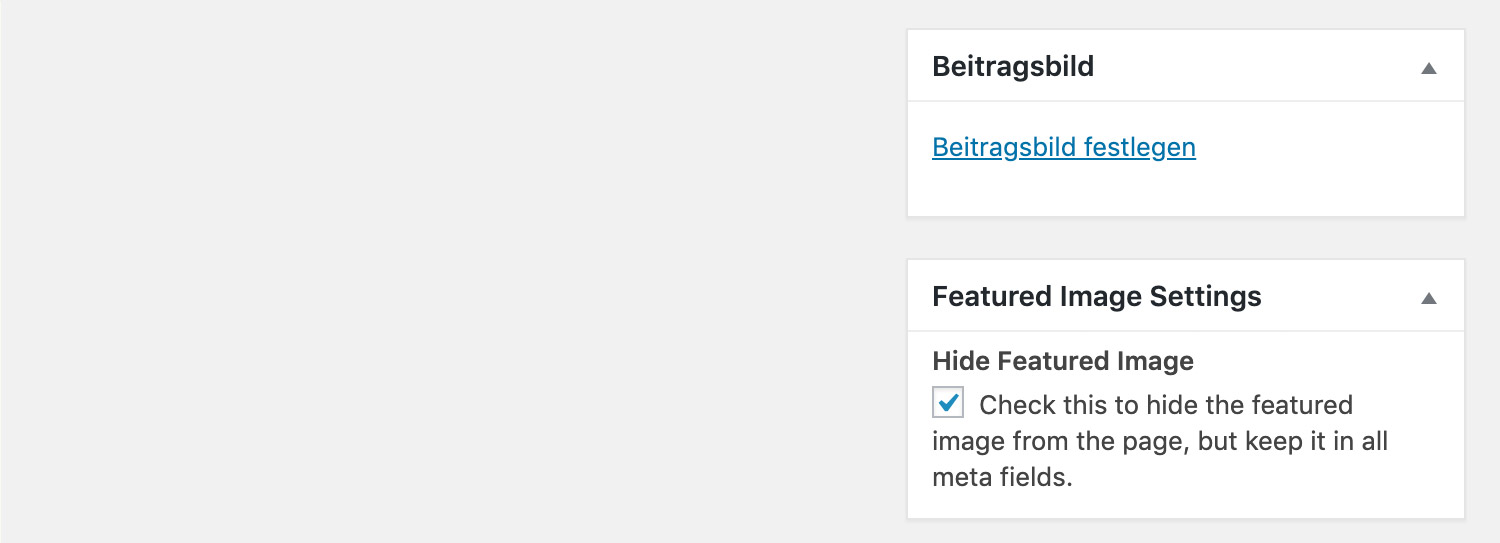 Im oberen Bereich siehst du das Titel-Feld, um den Titel einzugeben, sowie den Inhalts-Editor, um den Text einzugeben. Darunter schräg rechts findest du weitere Bereiche wie z. B. "Beitragsbild" und "Featured Image Settings".