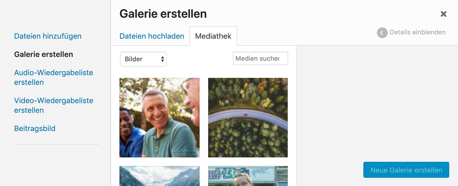 Dort unter dem Tab "Mediathek" kannst du vorhandene Bilder auswählen oder unter dem Tab "Dateien hochladen" Bilder hochladen. Wenn du die Bilder ausgewählt hast, klicke unten rechts auf "Neue Galerie erstellen".