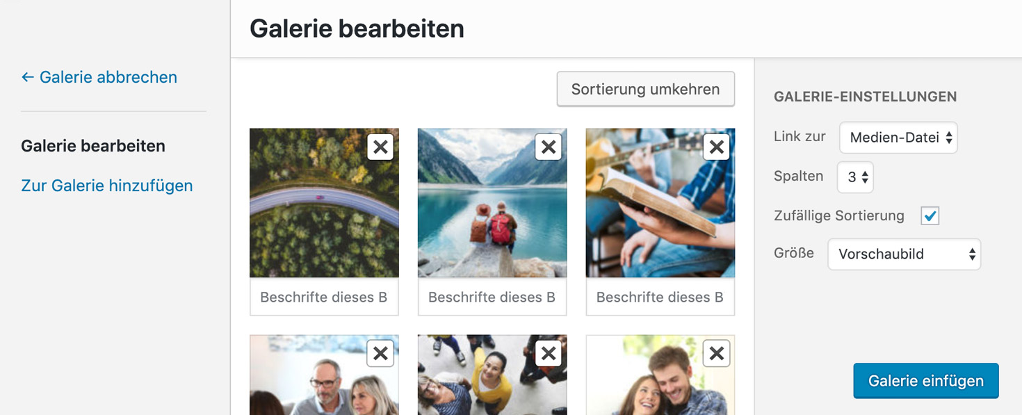 Falls du eine vorhandene Bildergalerie bearbeiten willst, klicke einfach im visuellen Editor auf die Vorschaubilder der Bildergalerie, dann erscheint ein Stift-Icon mit dem du per Klick die Bildergalerie wieder bearbeiten kannst.