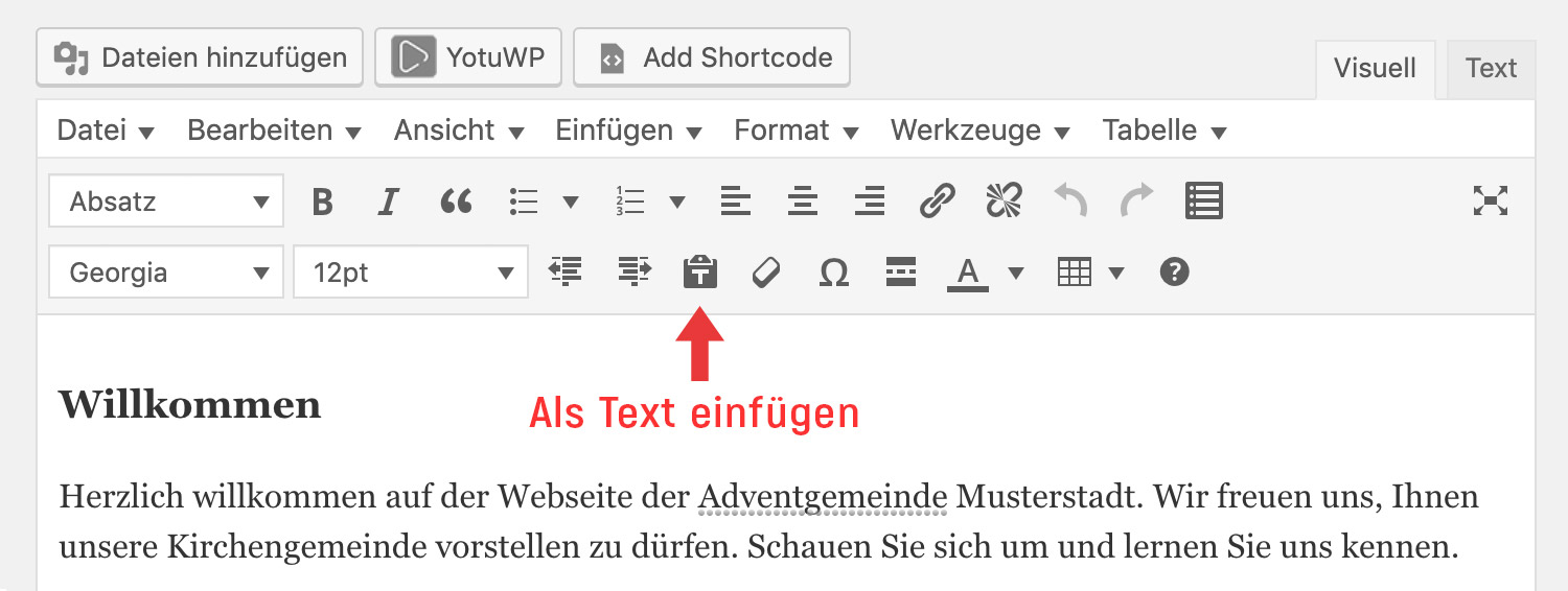 Der Inhalts-Editor besteht aus zwei möglichen Darstellungsformen, dem Editor „Visuell“ und dem Editor „Text". Du kannst zwischen den beiden Editoren wechseln, indem du auf die jeweilige Registerkarte oben rechts im Inhalts-Editor klickst. Auch wenn bereits Inhalte eingetragen sind, ist ein Wechsel möglich, ohne dass die Inhalte verloren gehen. Das Bild unten zeigt den visuellen Editor.