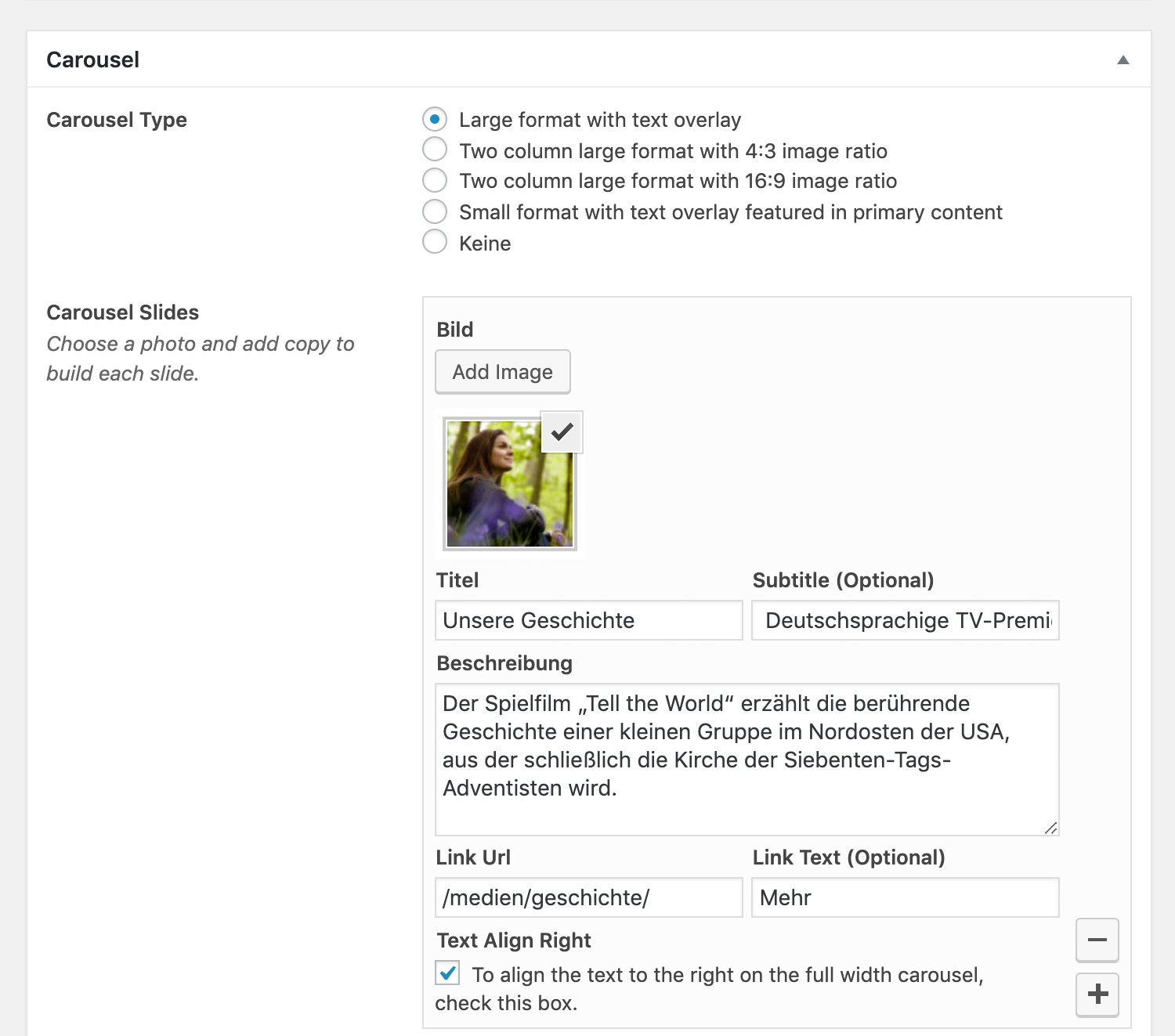 Unter dem Bereich "Carousel" kannst du die oberen Banner auf der Starseite bearbeiten. Es gibt mehrere Felder zur Texteingabe und auch ein Feld zum Hinzufügen des Banner-Bildes (Pixel Breite/Höhe: 1600x600).