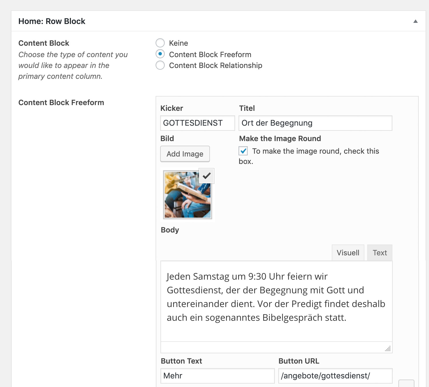 Im oberen Bereich siehst du das Titel-Feld und den Inhalts-Editor mit dem Inhalt. Darunter hast du auch noch weitere Bereiche wie z. B. "Home: Row Block".